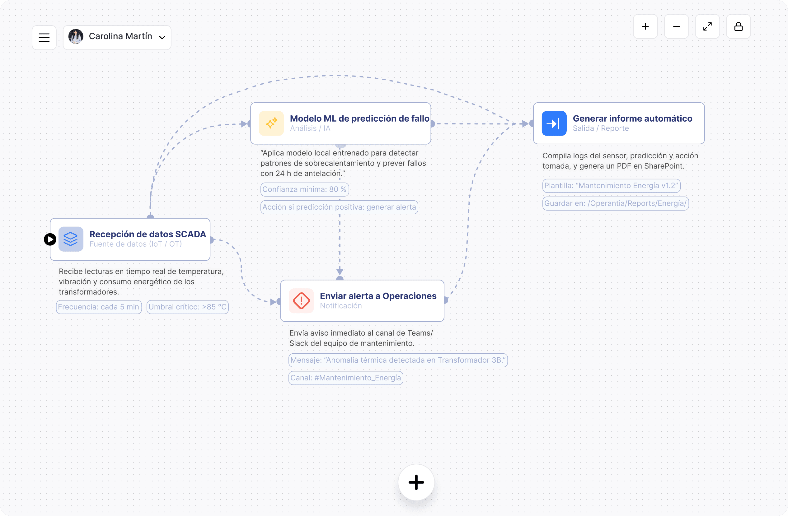 El sistema utiliza un modelo de comprensión semántica capaz de interpretar preguntas en lenguaje humano, como: “Muéstrame los contratos activos en LATAM” o “Compara el consumo energético por planta”. Devuelve resultados estructurados, gráficos o flujos automáticos según el contexto.